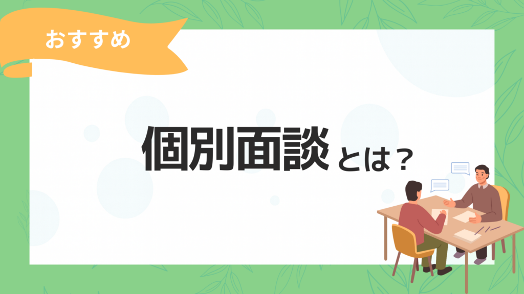 個別面談とは?目的と特徴をわかりやすく解説 個別面談とは、企業や学校、団体などが一人ひとりと時間をとって行う面談のことです。短い時間でも深い話ができるのが特徴... -